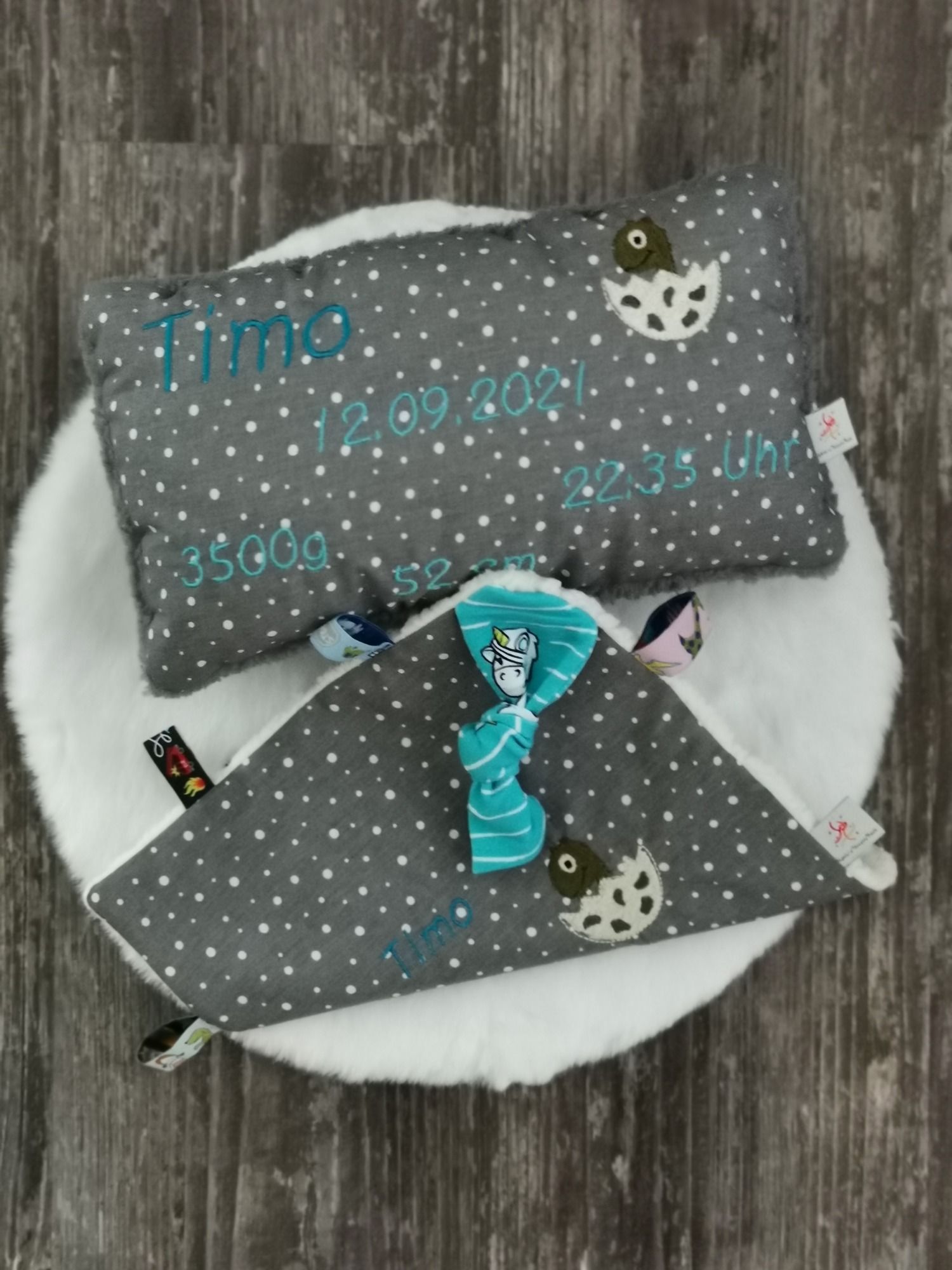 Ihr bekommt bei mir süße Kissen mit dem Namen des Kindes und den Geburtsdaten.